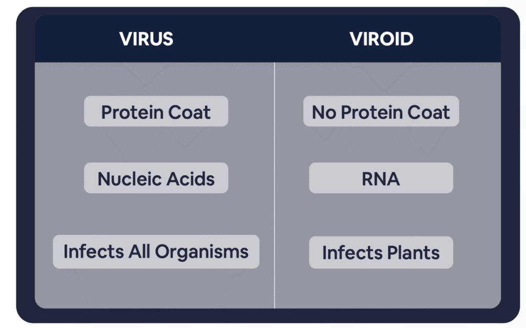 Viroids only replicate in plants. Also, viruses are more complex than viroids. Viroids are compounded by only RNA, while viruses are composed of a protein capsule enveloping their genetic material.